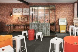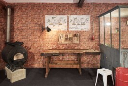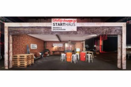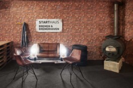 Weil ja besaglich viele Ideen, Erfindungen und Firmen in kleinen Garagen entstanden sind, haben wir dieses Thema für einen unverwechselbaren Messestand aufgegriffen. Starthaus Bremen hat in dieser Garage auf der MO1N Startup zum Thema Existenzgründung beraten. Das Areal mit Backstein-Optik und Patina wird ergänzt durch eine originale Zapfsäule, ein altes Pförtnerhäuschen, einem Werkstattofen und einem Rolltor. Es entsteht ein Ambiente zwischen American Diner, Kaffeehaus und Auto-Werkstatt mit einer verspielten und einladenden Atmosphäre im »Used Look«.