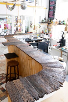 Für den Kulturort »Kukoon« in der Bremer Neustadt haben wir einen Tresen entworfen. Neben den Ansprüchen der Widerstandsfähigkeit und Stabilität sollte dieser natürlich, schick und einladend sein. Entstanden ist ein geschwungenes, nach oben zulaufendes Objekt, das an einen Schiffskörper erinnert. Das Material entstammt teilweise von der Bremer Hansekogge.